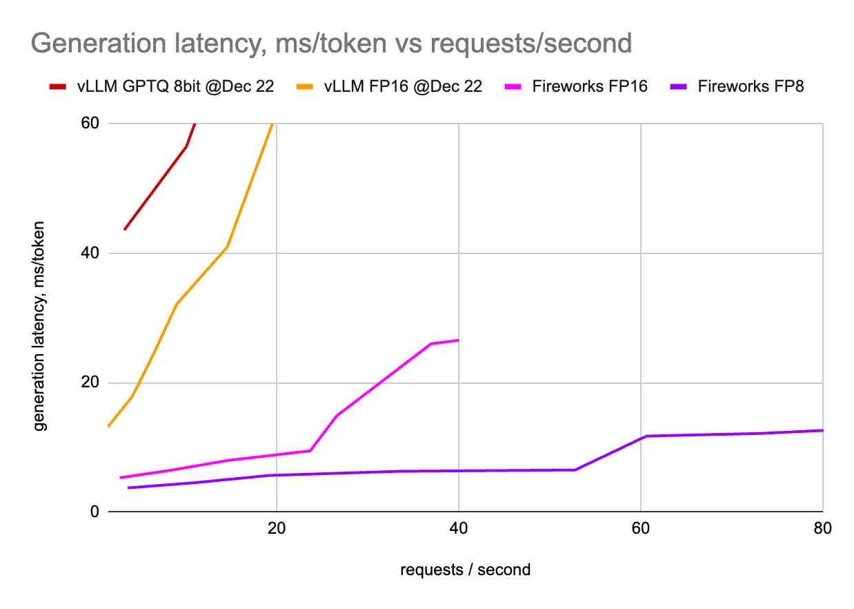 - Fireworks FP8 implementation significantly improves over the already quite efficient Fireworks FP16 implementation.