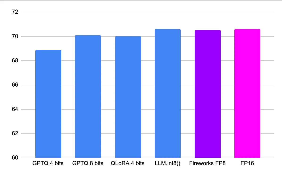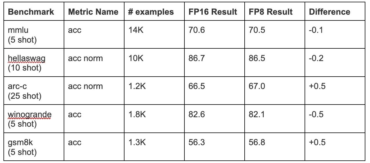 Based on these results we can make a conclusion that Fireworks FP8 implementation has a very small base model quality impact, which will be negligible in concrete fine-tuned versions.