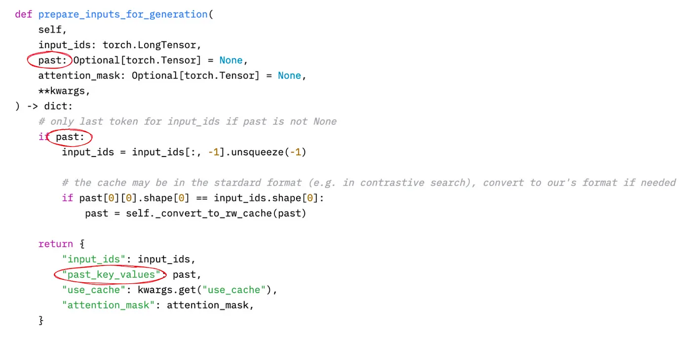 We noticed that the original implementation of Falcon models available on HuggingFace has an unfortunate bug in the model interface. The parameter representing the KV-cache is named inconsistently, and using Python's kwargs masks the issue.