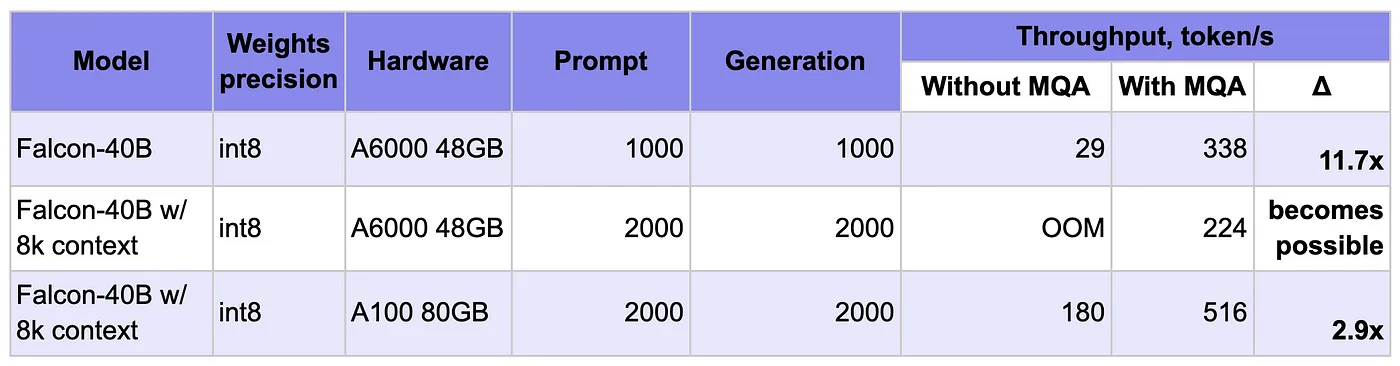 We see that with Falcon-40B, 4k total tokens, and an A100 GPU (with 40GiB free memory), using MQA allows us to increase throughput by almost 3x thanks to the larger batch size. The effect is more pronounced on an A6000 GPU with 48Gb of RAM. Without MQA, the KV-cache capacity is very limited, and the GPU can't even fit a single long sequence. MQA makes A6000 usage practical, enabling long sequence processing and 10x+ higher throughput on shorter sequences.