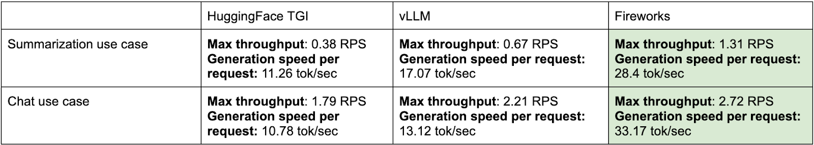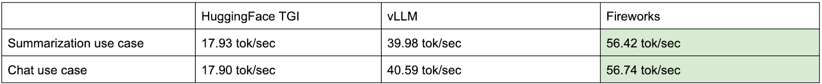 The table below shows that Fireworks dedicated deployments offer ~3x the speed as Hugging Face Text Generation Interfaces (TGI) on the same GPU configuration of 8xA100s with Llama 70B for 1 concurrent request. The summarization use case uses 3500 input tokens and 350 output tokens while the chat use case uses 350 input tokens and 350 output tokens. H100s will also be available for even faster speeds!