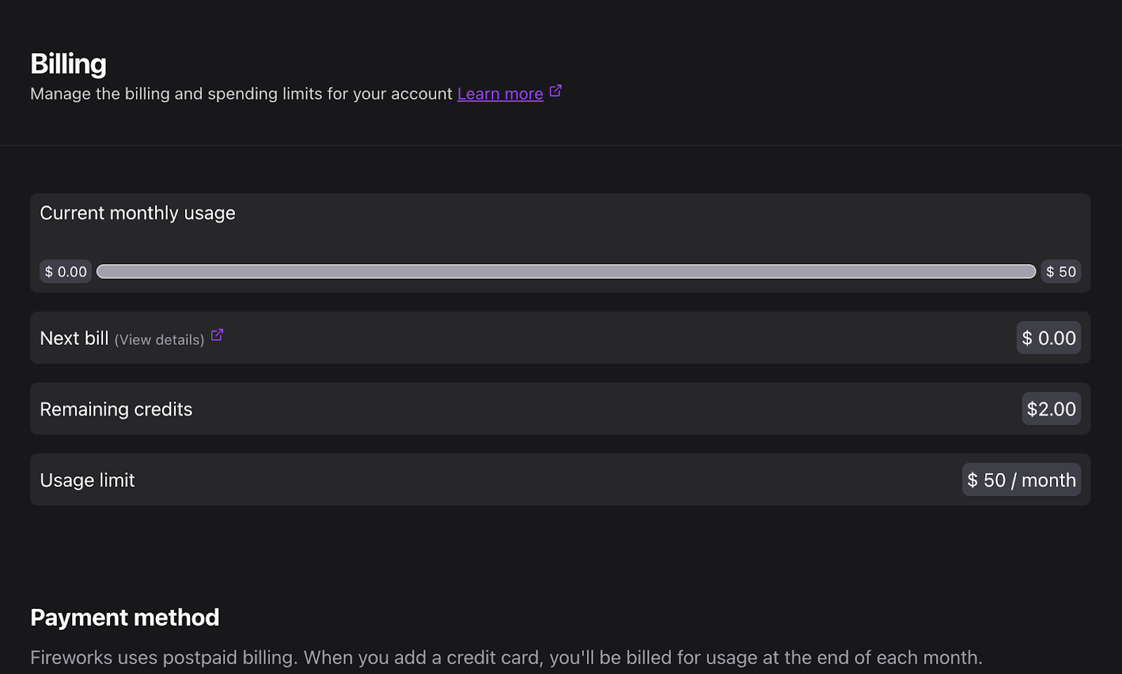 Previously purchased or gifted credits will still be linked to your account and used before post-paid billing kicks in. If you have specific questions or comments about postpaid billing, please contact us at inquiries@fireworks.ai. (Note: Users are enrolled in postpaid billing by adding their credit card). The switch to postpaid billing will be rolled out to existing Fireworks users across the next week. All new Fireworks users will immediately see the change.